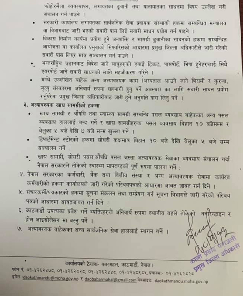 सरकारी कार्यालय, बैंक तथा वित्तीय संस्था र अरु अत्यावश्यक सेवा दिने कार्यालय सञ्चालन हुनेछ । सरकारी कर्मचारी, बैंक तथा वित्तीय संस्था र अरु अत्यावश्यक सेवामा कार्यरत कर्मचारीले परिचयपत्र देखाएर आवतजावत गर्न सक्नेछन् ।
