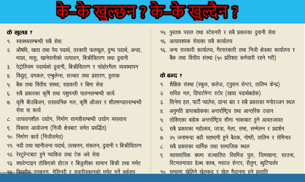 त्यस्तै एम्बुलेन्स, खानेपानी, स्वास्थ्य, खाद्यान्न, तरकारी, फलफूल, दुग्धजन्य पदार्थ, बैंक, वित्तीय संस्था दूरसञ्चार, इन्टरनेट, क्वारेन्टिन, आइसोलेसन, फोहोरमैला व्यवस्थापन लगायतका ढुवानीका साधन सञ्चालनमा कुनै रोक हुने छैन ।