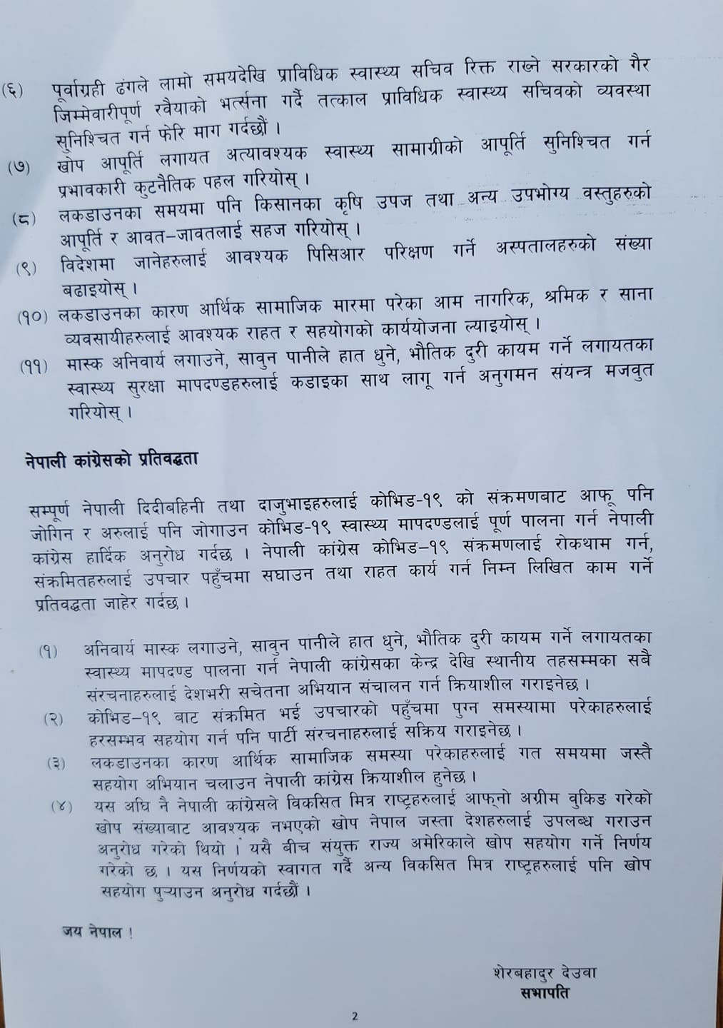 देउवाले कोरोनाको संक्रमणका कारण जनताले भोगिरहेको समस्याबाट पार पाउन संक्रमण रोकथाम र उपचारको समुचित प्रवन्ध मिलाइ निषेधाज्ञाको समयलाई पूर्ण रुपमा सदुपयोग गर्न आवश्यक कामहरु गर्न आग्रह गर्दै सरकारलाई ११ बुँदे सुझाव समेत दिएका छन् ।