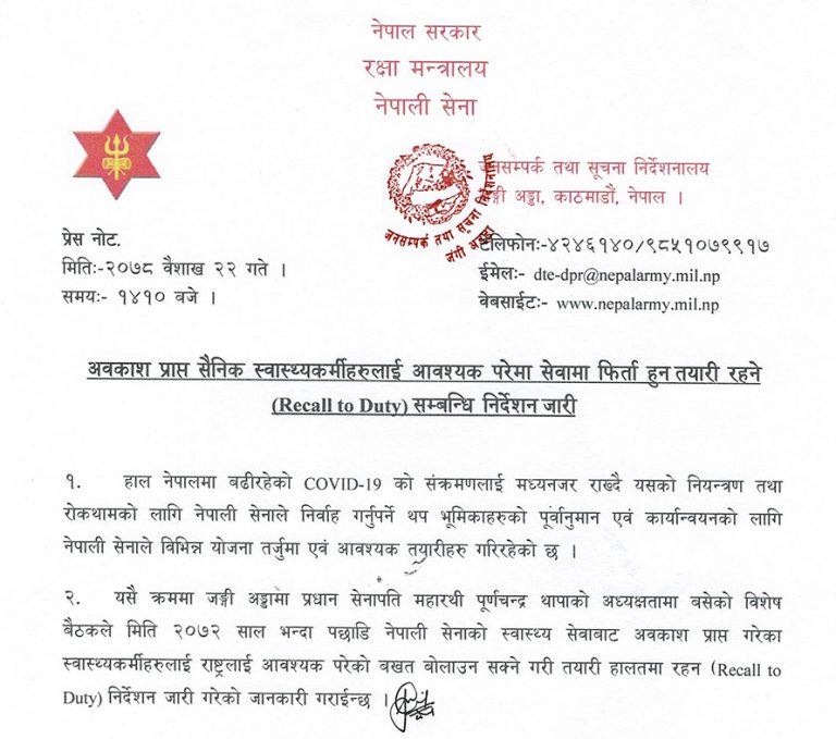 काठमाडौं , बैशाख २२। नेपाली सेनाले अवकाशप्राप्त सैनिक स्वास्थ्यकर्मीलाई सेवामा फर्किन तयार रहन निर्देशन दिएको छ ।