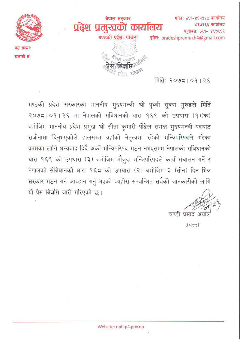 प्रदेश प्रमुख सीता पौडेलले मुख्यमन्त्री गुरुङको राजीनामा स्वीकृत गर्दै नेपालको संबिधानको धारा १६८ को उपधारा २ बमोजिम तीन दिनभित्र सरकार गठन गर्न आव्हान गरेकी छन् ।