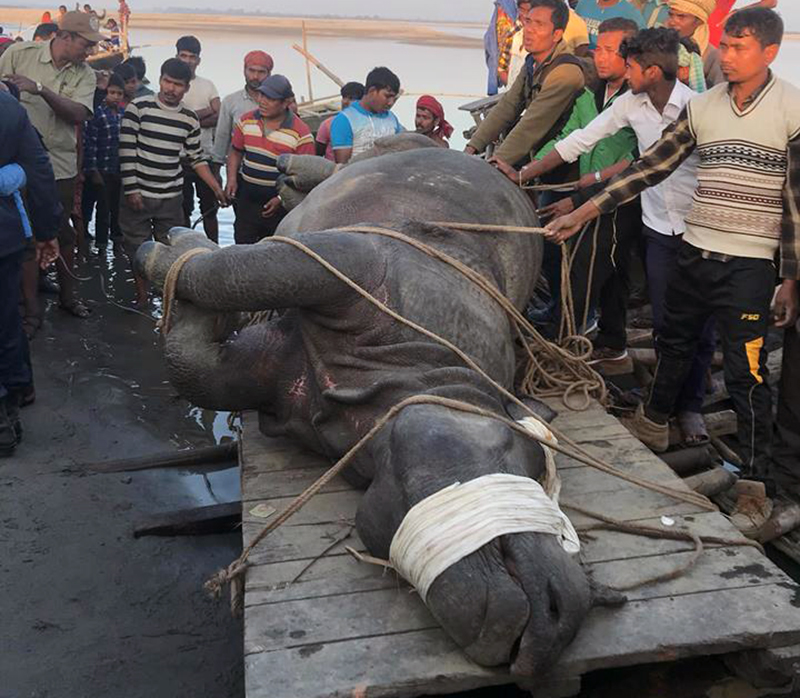 बाढीले बगाएर भारत पुर्याएको गैंडालाई डुङ्गामार्फत घर फर्काइयो, उद्धारमा भारतीयको असहयोग