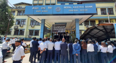 काठमाडौं , बैशाख ४ । सरकारले गभर्नर महाप्रसाद अधिकारीलाई निलम्बन गरेको विरोधमा नेपाल राष्ट्र बैंकका