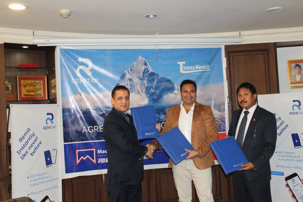 काठमाडौँ, १ माघ । माछापुच्छ्रे बैंक, टाइम्स रेमीट रए.एम.भी. टेलकम्पनी बीचबैंकका ग्राहकहरुका साथै सर्वसाधारणका लागि सुविधा स्वरुप