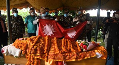 काठमाडौं । राष्ट्रकवि माधवप्रसाद घिमिरेको पार्थिव शरीरमा उपप्रधानमन्त्री ईश्वर पोखरेलले राष्ट्रिय झण्डा ओढाएर श्रद्धाञ्जली अर्पण