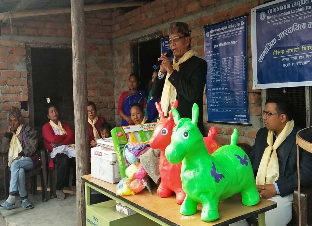 स्वावलम्बन लघुवित्त वित्तीय संस्था लि.शाखा कार्यालय धरान, सुनसरीले स्थानीय बाल विकास केन्द्रलाई भौतिक तथा शैक्षिक