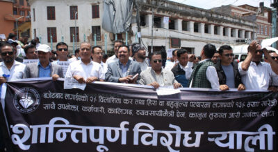 काठमाडौं, २५ जेष्ठ । काठमाडौंको न्युरोडमा सुनचाँदी व्यवसायीहरूले प्रदर्शन गरेका छन्। आइतबार बिहान सुनचाँदी व्यवसायी