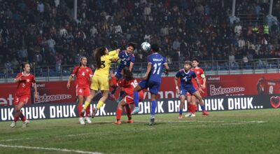 काठमाडौं, ८ फागुन। काठमाडौंमा जारी अन्तर्राष्ट्रिय महिला फुटबल प्रतियोगितामा बिहीबार नेपाल र लेबनानबीच खेल प्रतिष्पर्धा