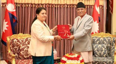 काठमाडौं, फागुन २१ । प्रधानमन्त्री पुष्पकमल दाहाल ‘प्रचण्ड’ले राष्ट्रपति विद्यादेवी भण्डारी समक्ष नेपाल सरकारको वार्षिक