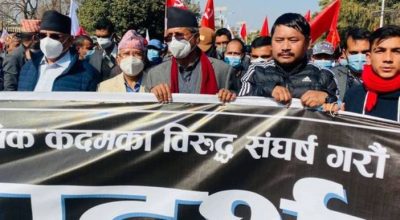 काठमाडौं, माघ २८ । प्रतिनिधिसभा विघटनलगायत प्रधानमन्त्रीका असंवैधानिक कदमविरुद्ध संघर्षरत नेपाल कम्युनिष्ट पार्टी ९नेकपा० ले