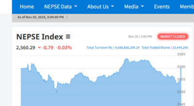 सेयर बजार सामान्य अंकले घटे पनि कारोबार रकम भने ४ अर्ब नाघ्यो
